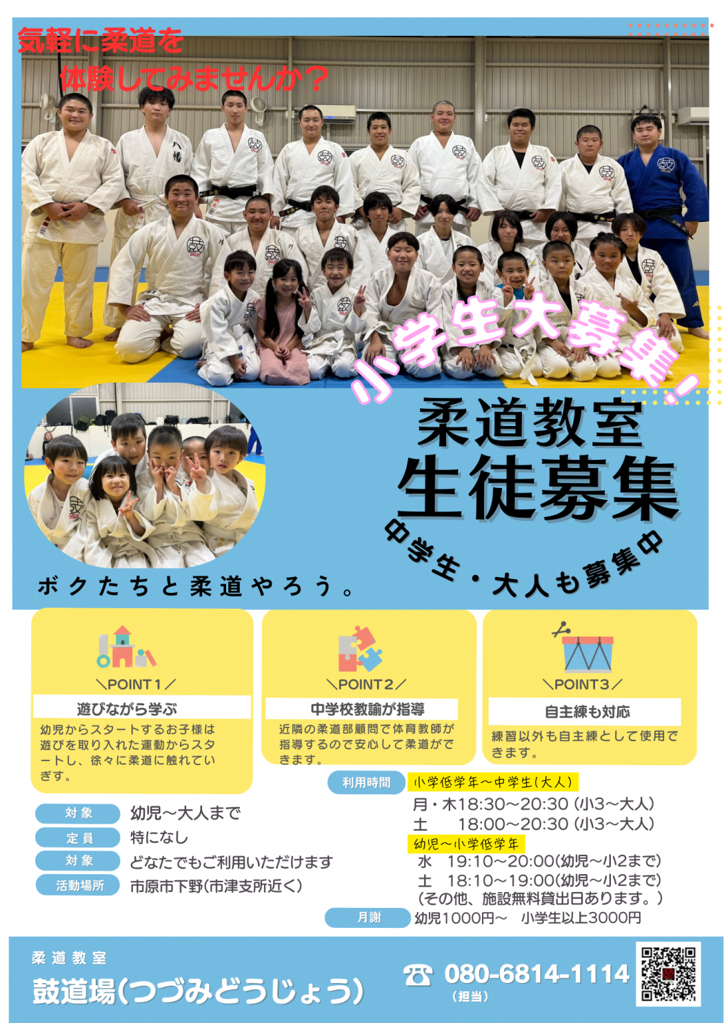 対象者:未就学児、小学生、中学生 練習時間:月曜日:19:00~21:00、木曜日:19:00~21:00、土曜日:9:30~12:00 月謝:入会金2000円、月額1000円